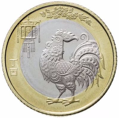 Третья монета, выпущенная в 2017 году, иллюстрирует птицу-петуха. Этот персонаж традиционно воспринимается как предвестник успеха и уверенности. Рисунок простой, четкий и выразительный, гармонично совмещённый с различными декорациями.