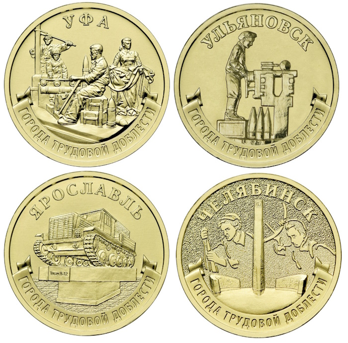 В рамках этой серии в 2025 году выпустили 4 монеты номиналом 10 рублей (Уфа, Ульяновск, Ярославль, Челябинск), каждая из которых посвящена отдельному городу, получившему статус «Город трудовой доблести». Монеты изготавливаются из стали с латунным гальваническим покрытием, имеют массу около 5,63 грамма и диаметр 22 мм. Их дизайн соответствует единому стилю серии, утверждённому Банком России.