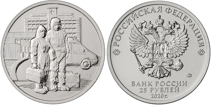 Монета создана в знак уважения и признания заслуг врачей и медицинского персонала, ежедневно спасающих человеческие жизни. На реверсе монеты 25 рублей 2020 «Труд медицинских работников» размещено изображение врачей в защитных костюмах с рабочими чемоданами, на фоне здания больницы и машины «Скорой помощи». Благодаря труду медиков миллионы людей получают шанс выздороветь и вернуться к нормальной жизни. Она напоминает обществу о важности профессии врача и медсестры, особенно в условиях прошедшей во всём мире пандемии COVID-19.