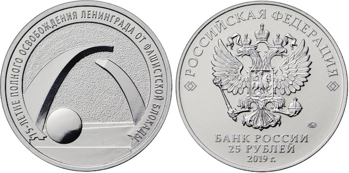 Освобождение Ленинграда от вражеской блокады стало важным событием Великой Отечественной войны. Выпущенная к годовщине её снятия, юбилейная монета номиналом 25 рублей 2019 «75-летие снятия блокады Ленинграда» содержит образы, связанные с героизмом ленинградцев и победой над врагом. Центральный элемент композиции - рельефное изображение мемориала «Разорванное кольцо. Это дань памяти людям, прошедшим через тяжелые испытания тех лет.