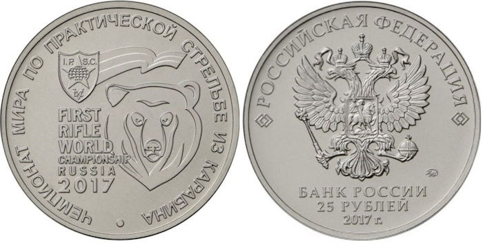 Памятная монета 25 рублей 2017 «Стрельба из карабина» посвящена спортивным дисциплинам. На переднем плане реверса изображён логотип «Чемпионата мира по практической стрельбе из карабина». Этот вид спортивной стрельбы считается одним из наиболее популярных и востребованных видов стрелкового спорта. Стрелковые соревнования проводятся ежегодно, привлекая тысячи участников и зрителей.