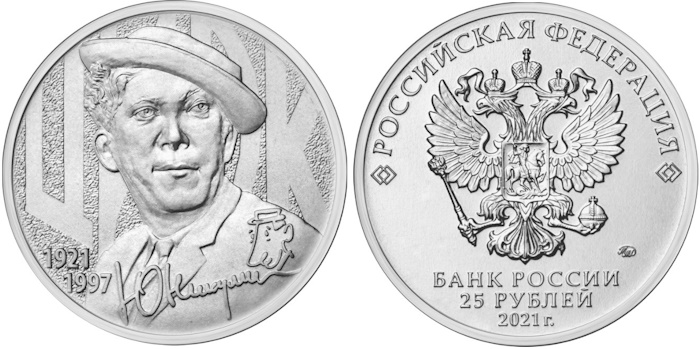 Известный актёр театра и кино, талантливый комедиант и телеведущий Юрий Владимирович Никулин оставил яркий след в истории советского кинематографа и культуры. Его творчество объединяло поколения зрителей, заставляя смеяться и переживать радости героев фильмов. В центре реверса монеты 25 рублей 2021 «Юрий Никулин» помещён автопортрет артиста, выполненный художником Сергеем Малютиным. И эта монета тоже была выпущена в цветном варианте.