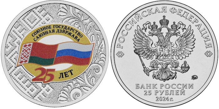 Монета посвящена союзническому сотрудничеству России и Белоруссии. На монете представлено два флага - российский и белорусский - соединённые лентой дружбы, олицетворяя солидарность и партнерство. Дата выхода монеты 25 рублей 2024 «Союзное государство» совпадает с 25-летней годовщиной подписания договора о создании союза двух государств.