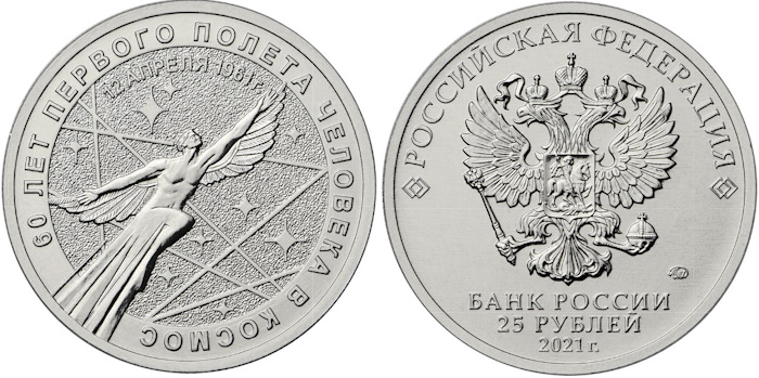 Первый полет человека в космос состоялся 12 апреля 1961 года. Эту историческую миссию выполнил советский космонавт Юрий Гагарин. Юбилейный выпуск посвящен именно этому знаменательному событию. На оборотной стороне монеты 25 рублей 2021 «60 лет первого полета человека в космос» изображена рельефная фигура парящего человека с крыльями, и указана дата - 12 апреля 1961 г. Эта же монета была выпущена и в цветном варианте.