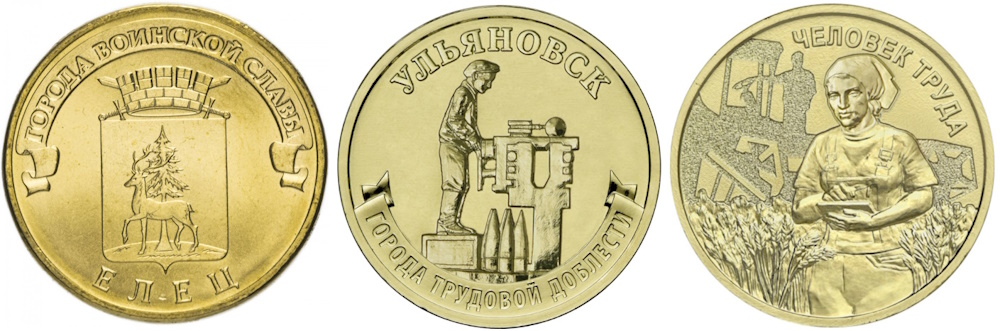 Особенно популярны среди коллекционеров и широкой публики памятные и юбилейные монеты 10-рублёвого номинала, выпускаемые Банком России в рамках различных тематических серий. В зависимости от серии, они посвящены Древним городам России, регионам Российской Федерации, Министерствам, Городам воинской славы и трудовой доблести, а также людям трудовых профессий.